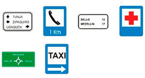 Este grupo informa sobre la proximidad de un servicio en la zona, como por ejemplo: paradas de buses, montallantas, aeropuertos o acopios de taxis. Normalmente se encuentran en vías rurales o carreteras nacionales, pero también existen dentro de las ciudades en espacios con alta concentración turística o señalizando servicios de alta prioridad, como hospitales. Son de color azul claro y su forma es un rectángulo en dirección vertical.