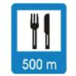 Señal que indica la distancia a la que se encuentra una zona de restaurantes o venta de comida y alimentos.
